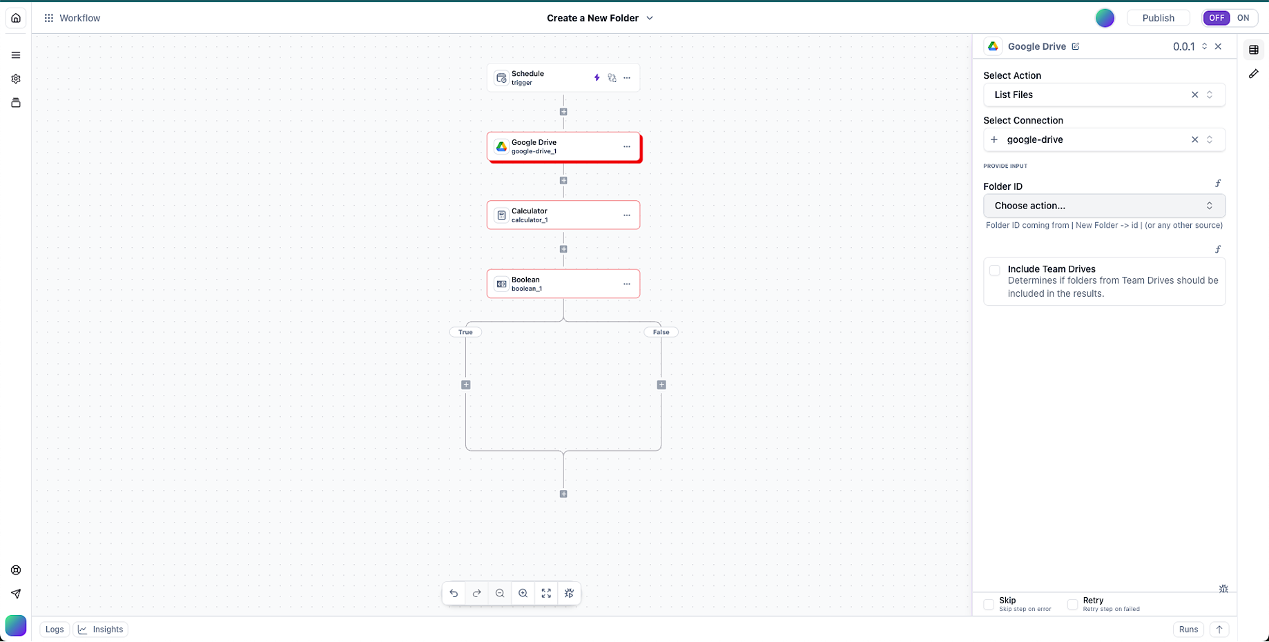 - Top Menu Bar: Provides access to rename, save, publish and turn on/off a workflow