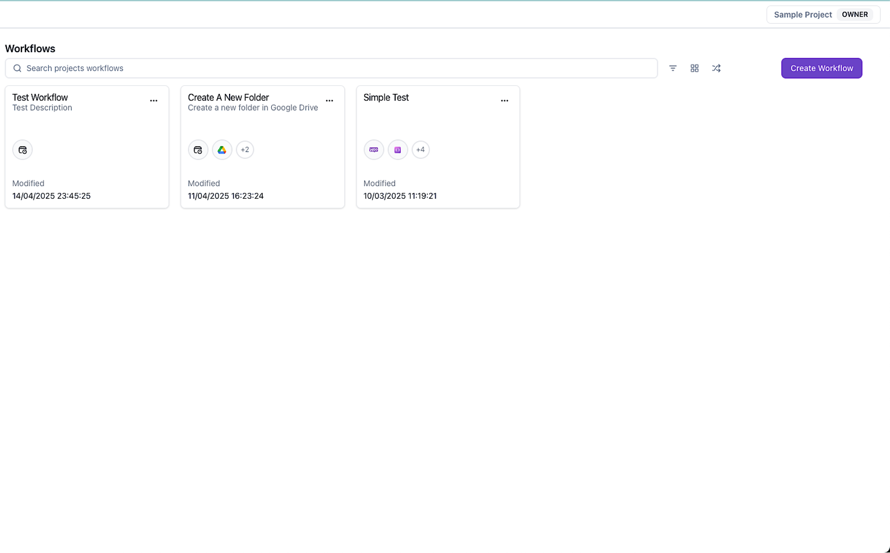 - Search & Filter: Find workflows by name, status, tag, or integration