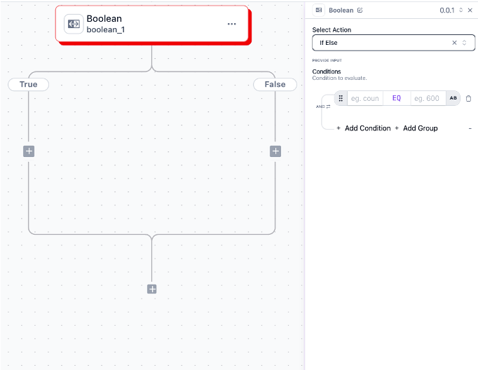 There are two types of conditional integrations Boolean and Branch. Boolean evaluates to either True or False while Branch can be configured with multiple conditions.