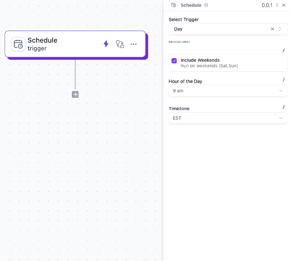 - Schedule Triggers: Time-based events (e.g., run daily at 9 AM, run every 2 minutes)